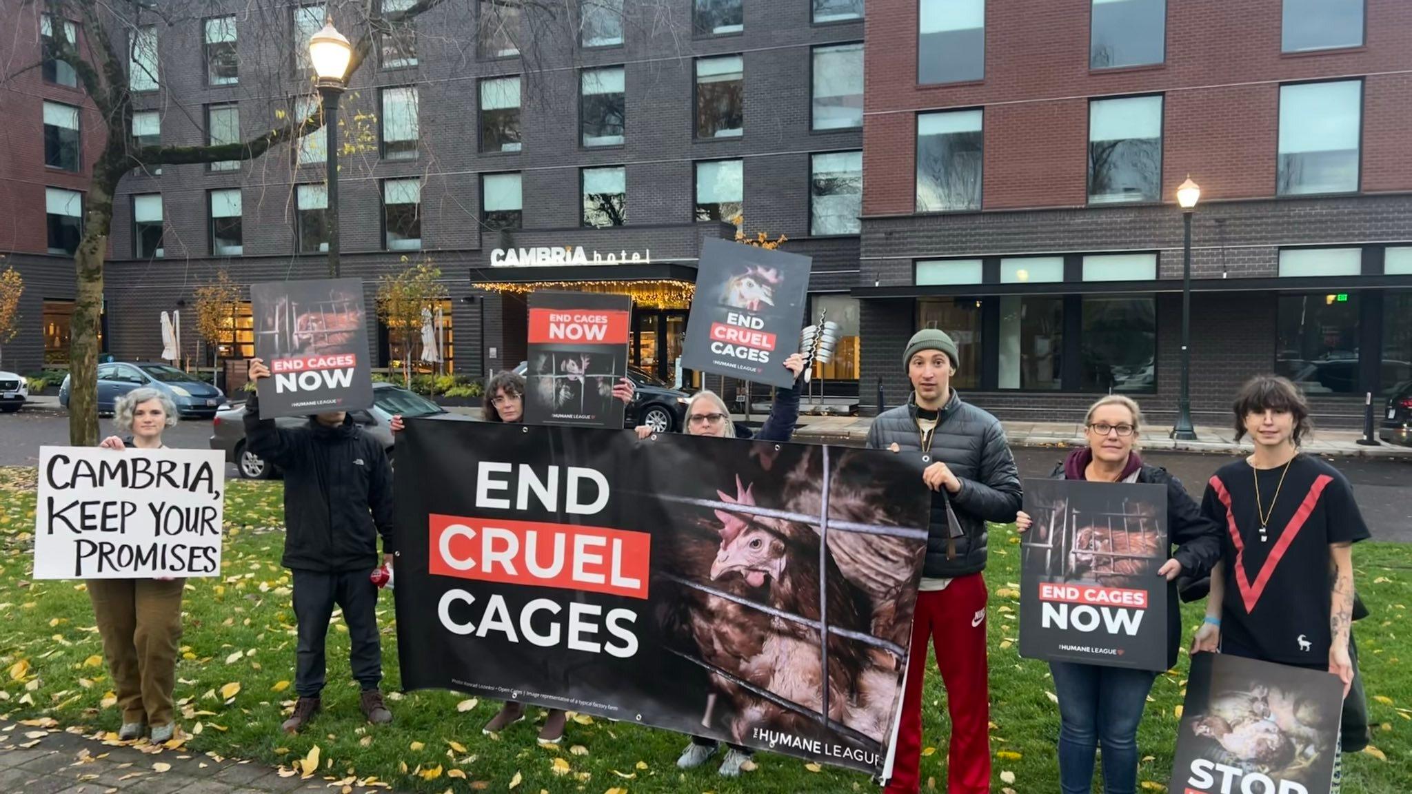 Cambria is an “upscale” brand belonging to Choice Hotels, a global chain in the center of an animal abuse scandal. As guests streamed in and out of the building—with many visiting from out of town for the Nike Cross Nationals happening that weekend—activists held signs and banners with images of suffering hens. They shouted into megaphones, rang cowbells, blew whistles, and banged on a drum, making noise for the animals suffering in Choice Hotels’ supply chains.