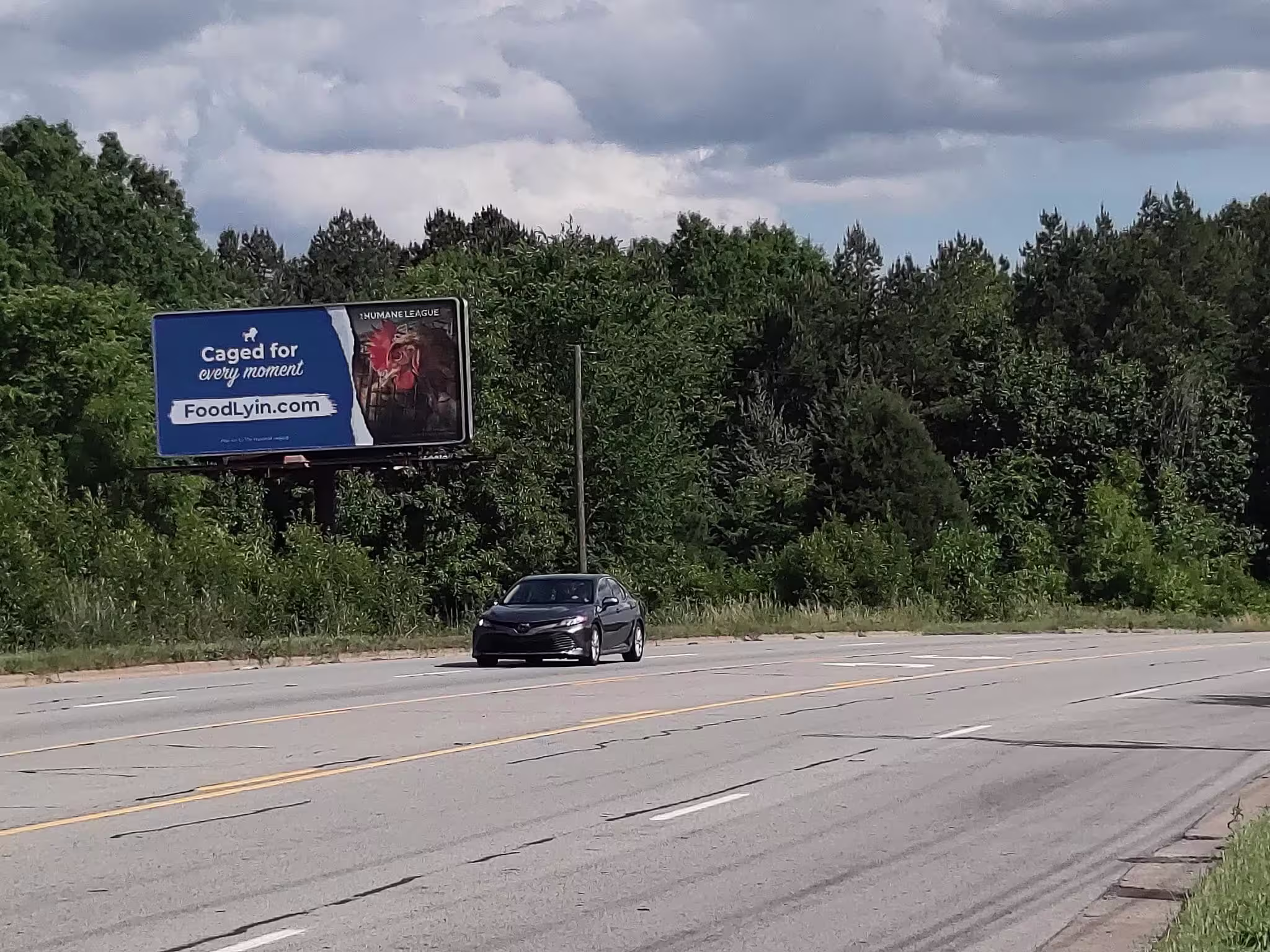 Another brings attention to how Food Lion’s parent company claims it “[wants] each animal in our brands’ supply chains to live in an environment that has adequate space for free movement.” The billboard reads, “Free movement? I cannot even spread my wings,” and includes a link to the website FoodLyin.com. Both show a caged hen on the right half of the billboard.